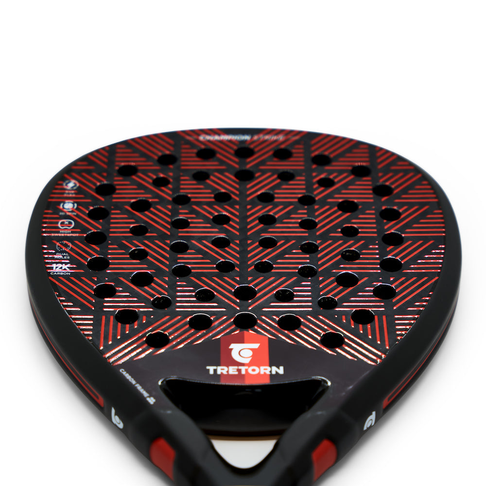 Discover CHAMPION STRIKE - The perfect racket for the offensive player! With an exceptional combination of technology and materials, this racket gives you the power to dominate, and the control to deliver precision shots. Let's look into the impressive features that CHAMPION STRIKE has to offer. CHAMPION STRIKE features a Japanese 12K carbon fiber layer that not only provides impressive power in your offensive shots but also a deep and energetic response. This gives you the ability to take control of the game and leave your mark on every point. Together with the EVA FLEX core, you get an outstanding mix of feel and touch in the game. Every shot feels precise and responsive, enabling you to play with small margins to maintain control over the game. Perfect for players with an exceptional abillity to control the ball. The racket is also equipped with a DUAL-hole pattern that optimizes the racket's contact points, enhancing the ability for controlled shots even when hitting outside the racket's sweetspot. The result? Constant power and precision that allow you to decide the pace of the game. Additionally, you can maximize your spin with our multi-directional 3D decal to surprise your opponents with variation in your game. CHAMPION STRIKE gives you the opportunity to be versatile and adapt your style to every situation.